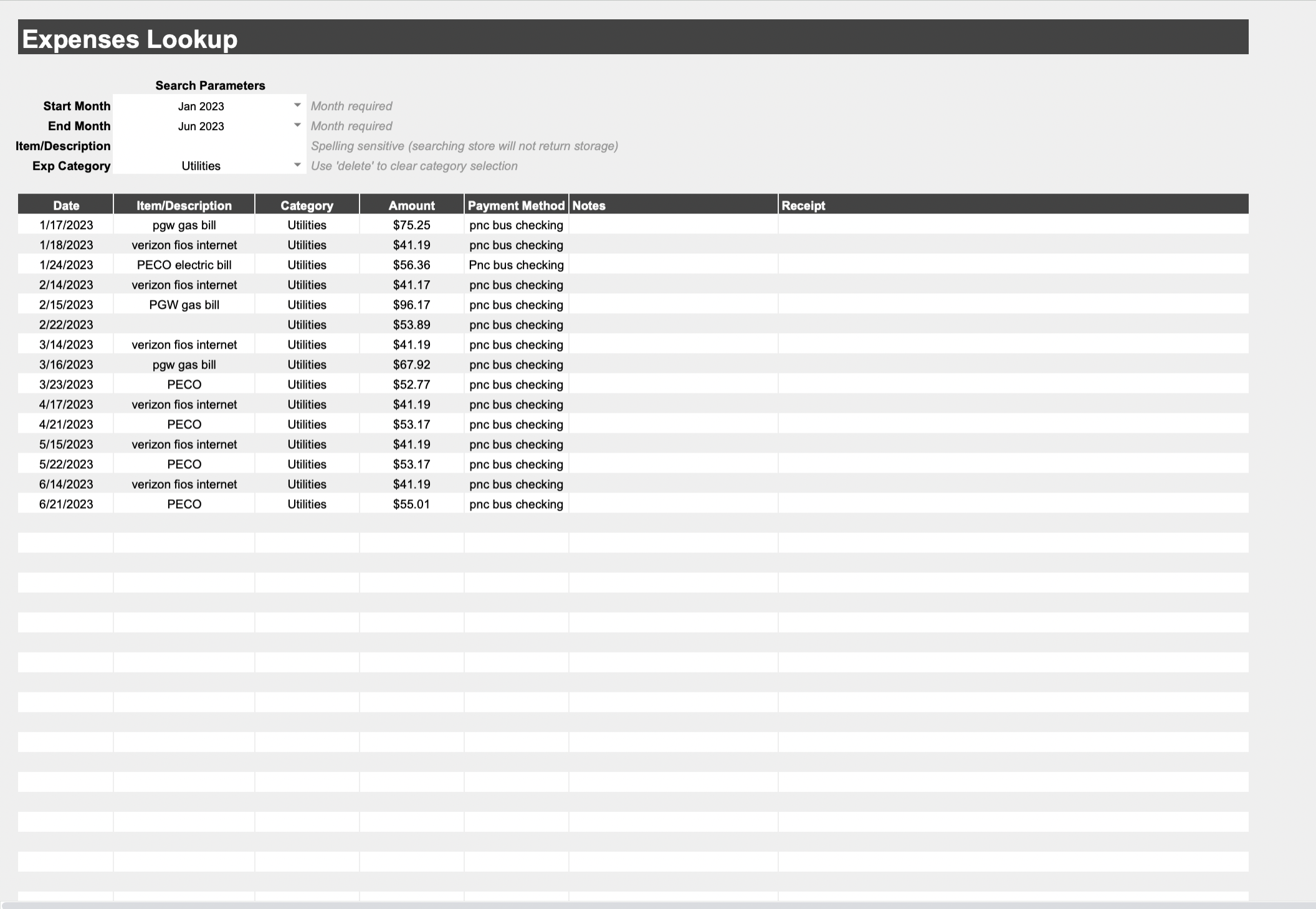 The Expenses Lookup allows you to search past expenses by date, description, and category.